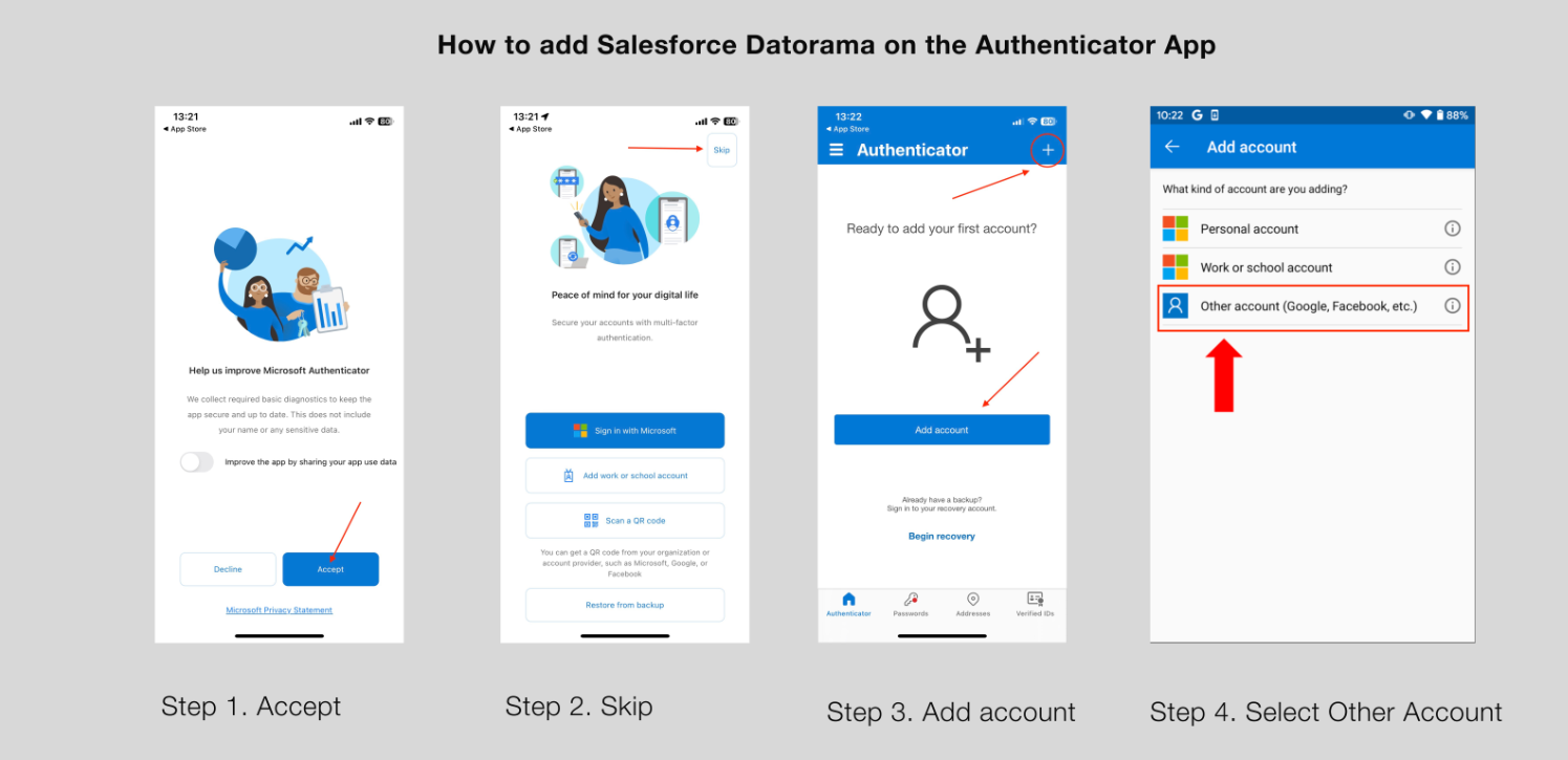 If you are downloading the Microsoft Authenticator app for the first time, follow the steps in the screenshot and steps below to set up and add an account for authentication.