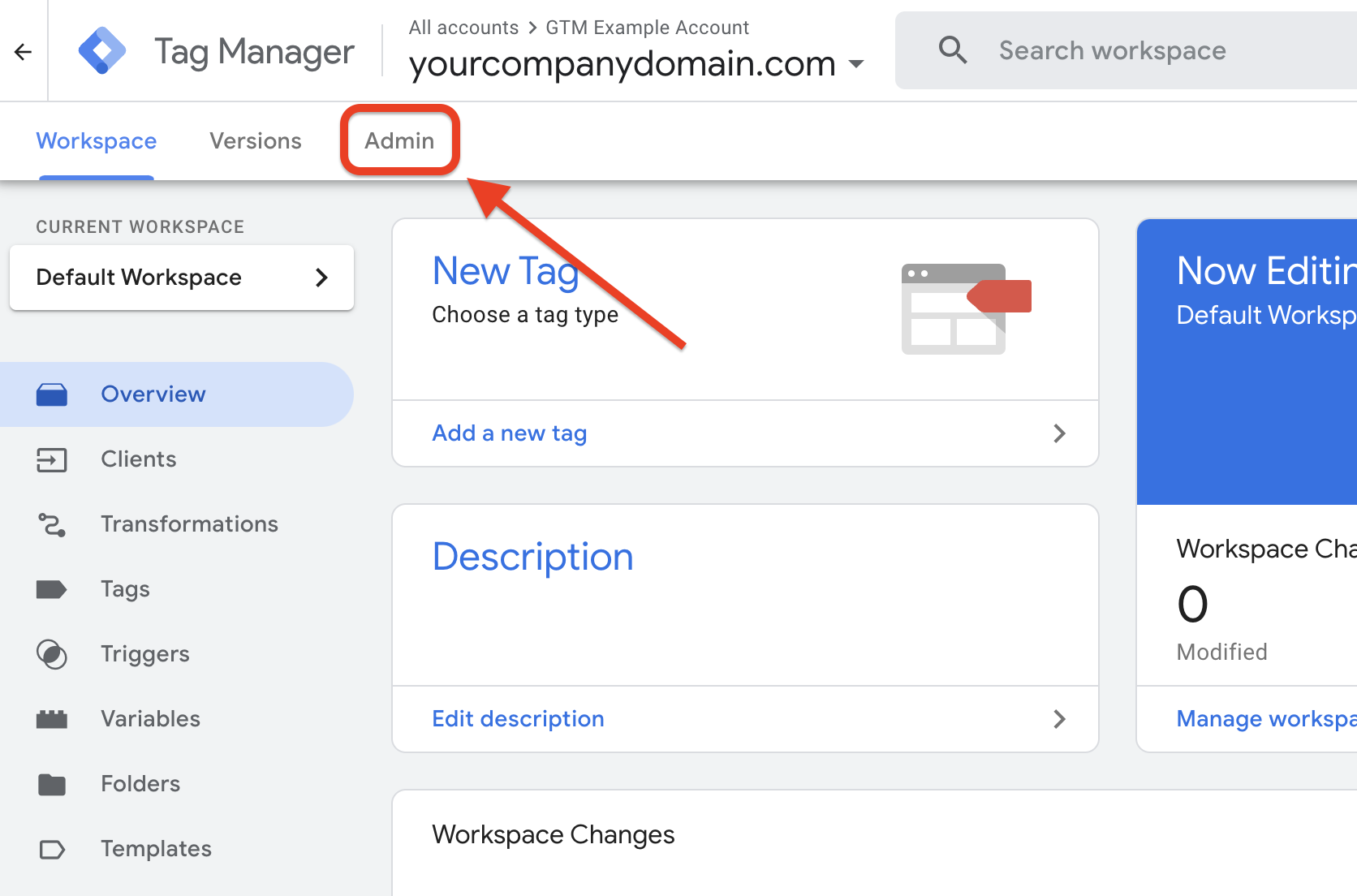 a. Add your container name (we recommend using your company’s domain name, the same name we used for your new GTM container in Part 1, Step 2b).