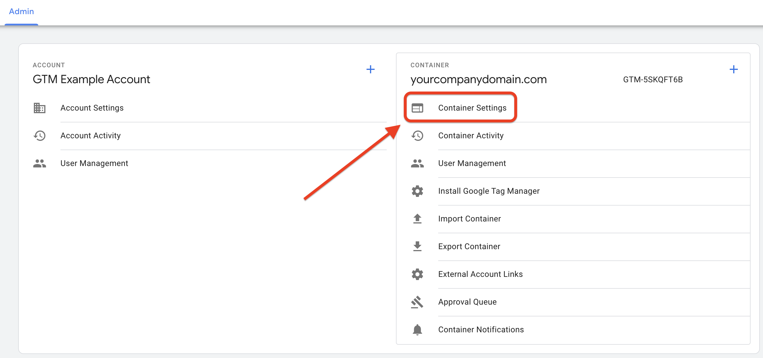 Go back to the Tag Manager tab you still have open. Navigate to your Container Settings. You can find that in the Admin tab once you close out of the pop-up you had opened.