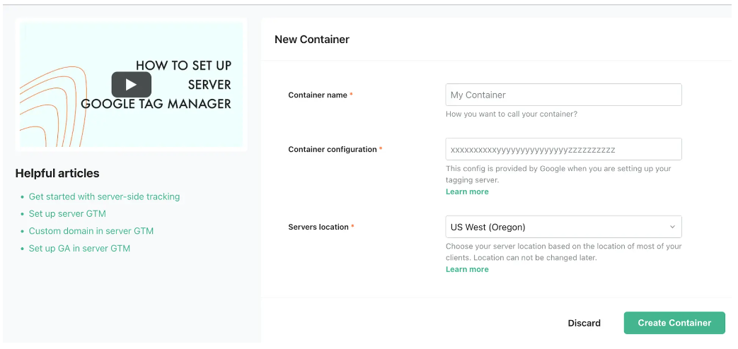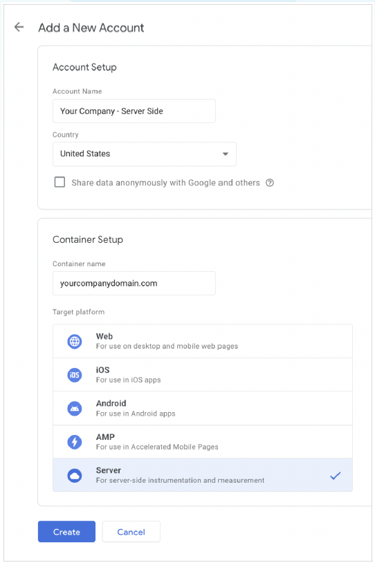 You should already have a standard (“Web”) GTM account in use. We’ll need to create a new “Server” GTM account. Here’s how: