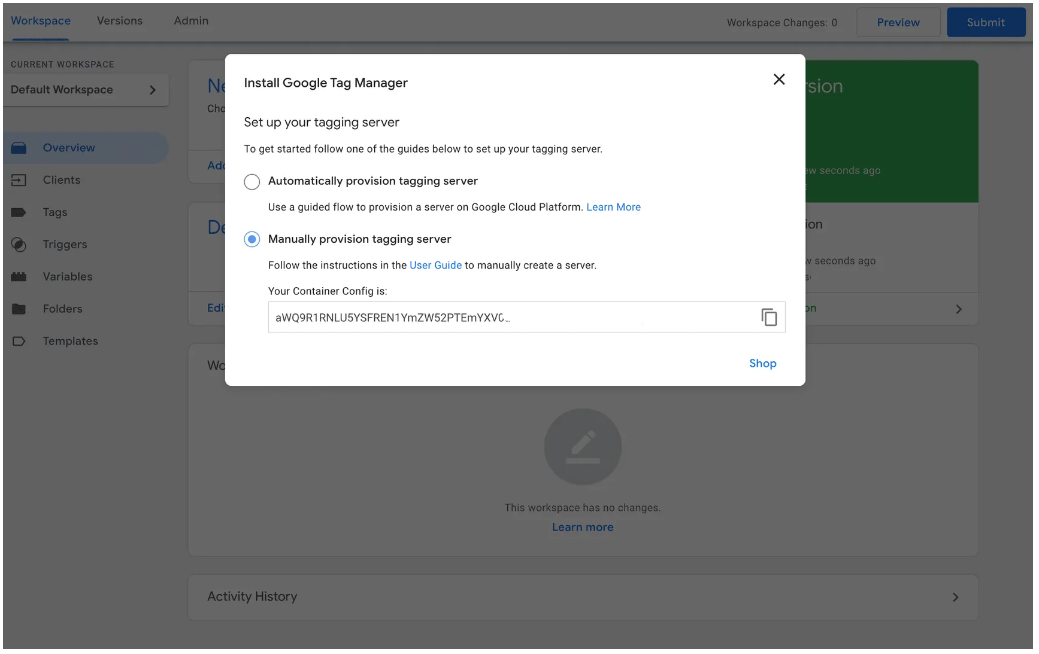 Your Server-Side Google Tag Manager (“SSGTM”) container is now created, and you will be sent to the Tag Manager interface. A pop-up will ask you how you’d like to set up a tagging server. “Automatically…” will be selected by default. Instead, select Manually provision tagging server.